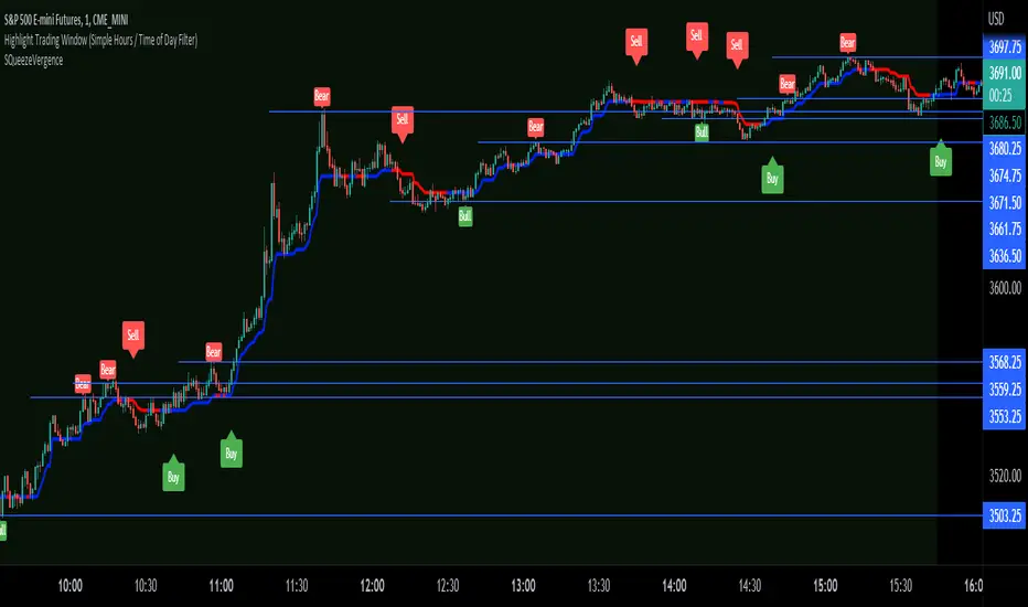 This is my SQueezeVergence indicator. It fires Buy and Sell signals based on squeeze momentum and trend. **It also creates Bull and Bear signals based on MACD divergence which should only be used as areas of support and resistance being as these signals repaint based on a 5 candle look back of pivots.** All settings are editable for better use. The default settings are what I use on the 1 Minute chart of ES to scalp. This is a simple indicator to help me get alerts on when I need to scalp. The divergence signals work well for areas of significance. I like to watch for breaks of these levels along with support and resistance. I hope this helps.
