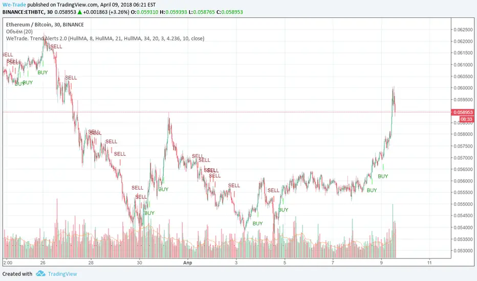 This alerts is created to understand the beginning and the reversal of the trend. Do not forget the rule: The trend is your friend. The arrows do not re-painting! Like most indicators, this one needs the support of technical analysis and strict algorithm of trade. Used for margin trading on BTC 0.97% / USD, ETH / BTC 0.97% , ADA / BTC 0.97% , BCH / BTC 0.97% , LTC / BTC 0.97% , and also in currency pairs like EUR/USD -0.05% , GBP/USD 0.10% . DO NOT (!) Use the indicator on tools, in which there is a rigid flat and strong pump and dump. Such coins were not created for movement on the trend! They are created for using a robot and pumping!