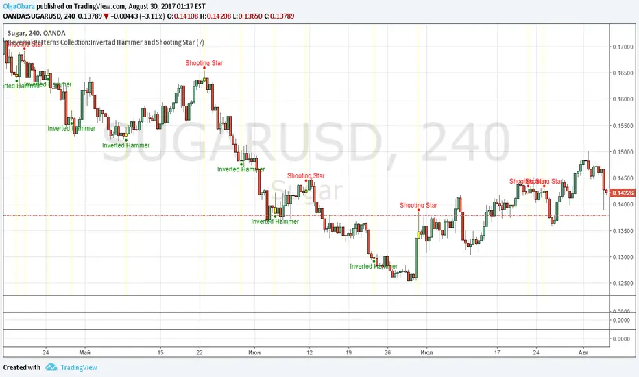 Script contains Inverted Hammer and Shooting Star models. User can select period for candle size calculation (for distinguish short and long candles), on/off highlighting of pattern candles.