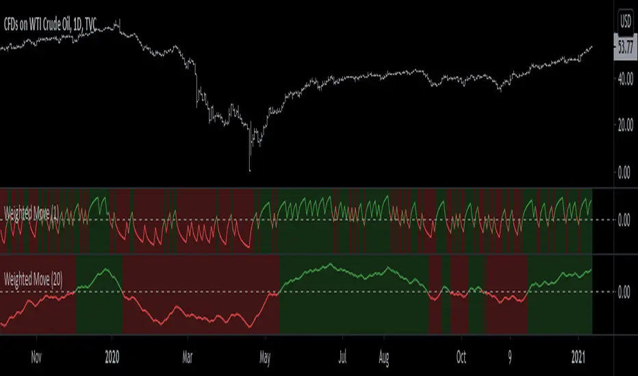 Hey guys, I've been away for some time...you guys miss me? Ha! Well I'm back at it because today I have another indicator for you guys. I call it Weighted Move. Nothing out of the ordinary. What it does is it tells you the overall sentiment. I kinda stumbled upon this idea by accident ;)