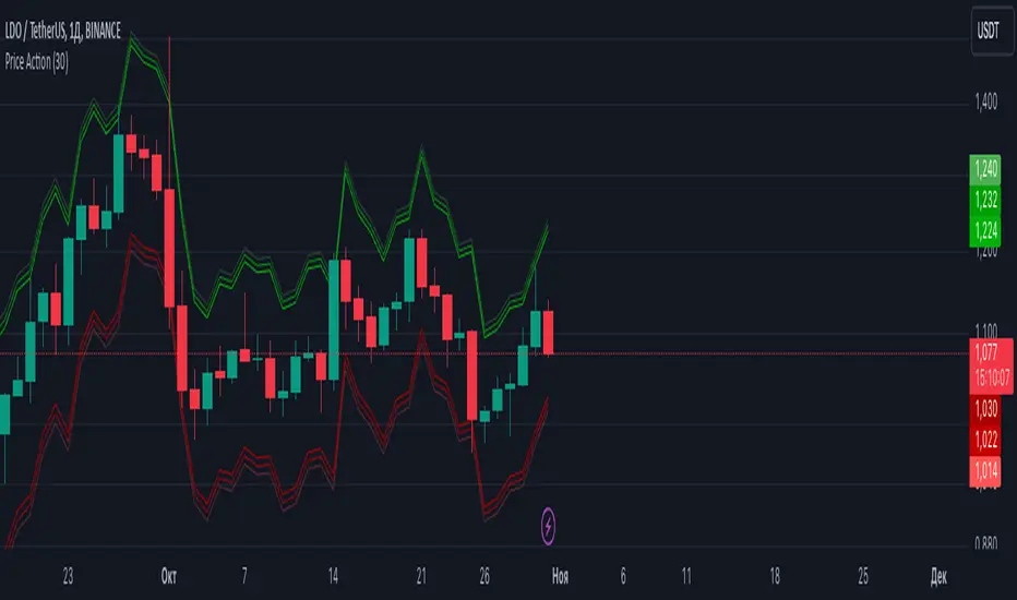 The main parameter is the period length (default is 30), used to calculate volatility with ATR (Average True Range). Data retrieval: The indicator takes the closing price and uses it for calculations. Channel calculation: Based on volatility, three levels of channels are created: the first is the base channel, while the second and third are expanded by 8% and 16%.