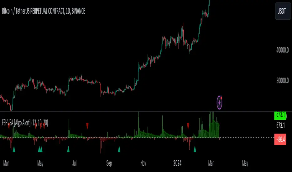 The FSHVSA plots a positive trend when a positive Volume smoothed Spread and EMA of Volume smoothed price is above 0, and a negative when negative Volume smoothed Spread and EMA of Volume smoothed price is below 0. When this conditions are not met it plots 0.