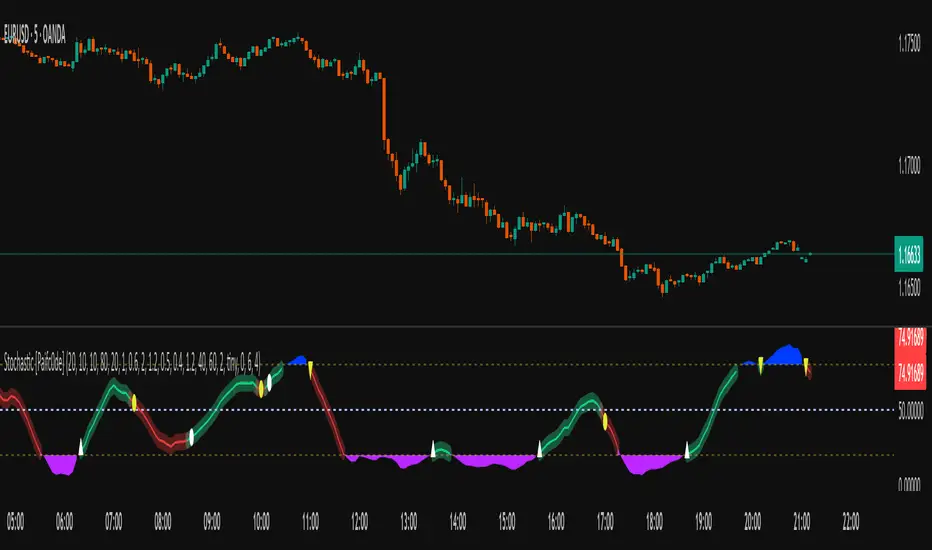 This indicator plots a standard stochastic oscillator (%K with smoothing and %D) and adds practical quality-of-life features for lower timeframes: optional visual masking when %K hugs overbought/oversold, neutral K–D cross markers, session-gated edge triangles (K crossing 20/80), and simple filters (minimum %K slope, minimum |K–D| gap, optional %D slope agreement, mid-zone mute, and a cooldown between markers). Display values are clamped to 0–100 to keep the panel scale stable. The tool is for research/education and does not generate entries/exits or financial advice.