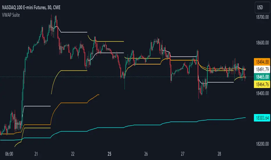 This indicator automates the plotting of various timeframe based VWAP Values. This utilizes a different calculation method for the standard deviations bands compared to the native Tradingview AVWAP. While the Tradingview AVWAP indicator calculates the standard devation based on the VWAP variance, this indicator calculates the std dev based on the price sum variance (i.e. the variance of the hlc3, ohlc4, etc. values).