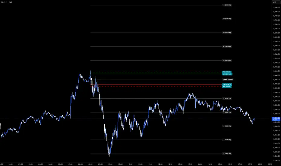 Rotation Levels (White): Fixed-point intervals above/below OR (ES: 15pts, NQ: 65pts)