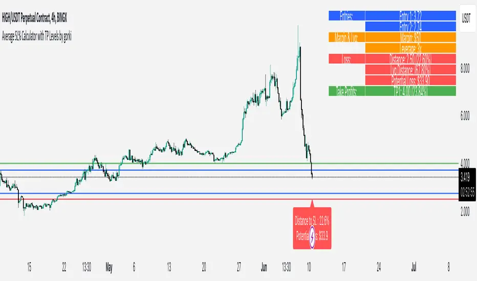 The "Average SL% Calculator with TP Levels" script, is a simple tool for traders to plan the trades and check how much loss they are going to receive if they run this strategy. This script calculates the average price of up to four entry points, determines the percentage distance to the stop-loss level, and provides potential loss information based on margin and leverage. Additionally, it includes multiple take-profit levels to help traders systematically capture profits. Visual elements such as horizontal lines and labels make it easy to monitor key levels directly on the chart.