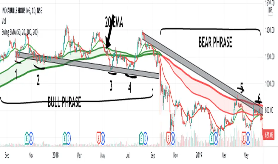 How to use it? - It is very easy to understand by looking at the example I gave where are the two different types of phrases. phrase bull phrase and bear phrase so 100 and 200 Ema is used as a support and resistance and to tell you which phrase is currently on the market on example there is a bull phrase on the left side and bear phrase on the right side by using your technical analysis you can find out a really good spot to buy your stocks on a bull phrase and too short on the bear phrase. 20 Ema is used as a knowing the current market behavior it doesn't make any difference on buying or selling as much as 100 Ema and 200 Ema.