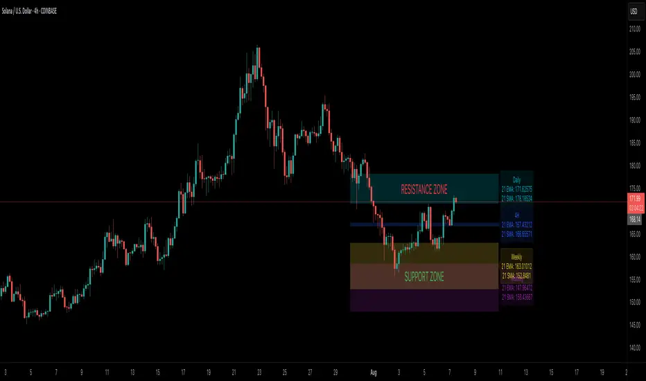 Indicator OverviewGet ready to elevate your trading game with the Multi-Timeframe Moving Average Support/Resistance Zones indicator. This advanced tool is engineered for traders who want to maximise efficiency without constantly switching between timeframes. By dynamically plotting support and resistance zones using the 21 SMA and 21 EMA, it reveals crucial price levels where trends may pause, reverse, or accelerate—giving you actionable insights in a fraction of the time.