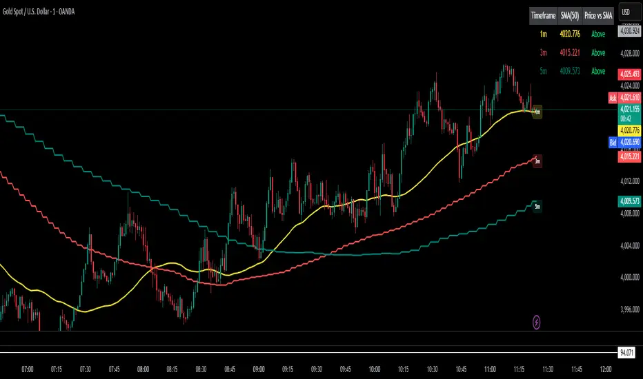 This indicator displays the Simple Moving Average (SMA) across multiple timeframes simultaneously on your chart. It helps traders quickly visualize trend direction across different intervals without switching charts.