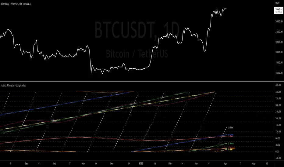 This indicator includes geocentric/heliocentric longitude lines with retrograde identification, Vedic Nakshatras, and astrological zodiac & aspects for each of the 9 planets plus the Sun & Moon. Hover over labels for additional information.