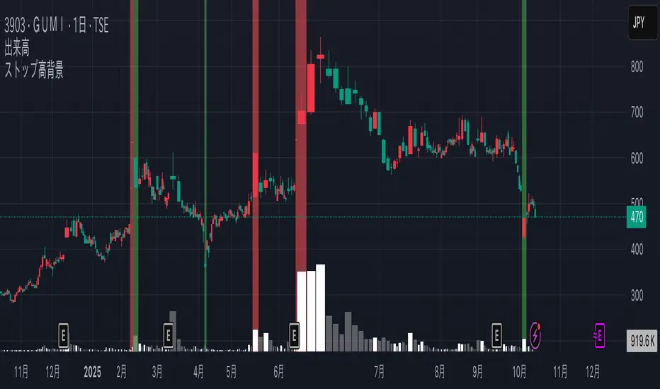 当日の高値がストップ高に達したバーは背景を赤色、安値がストップ安に達したバーは背景を緑色で表示します。