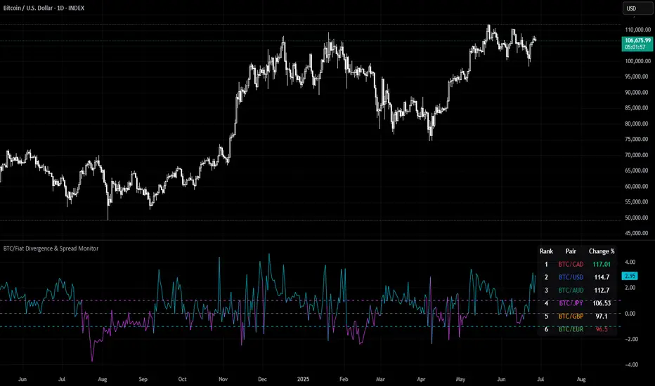 This indicator visualizes Bitcoin’s relative performance across multiple fiat currencies and highlights periods of unusual divergence. It helps traders assess which fiat pairs BTC has outperformed or underperformed over a configurable lookback period and monitor the dynamic spread between the strongest and weakest pairs.