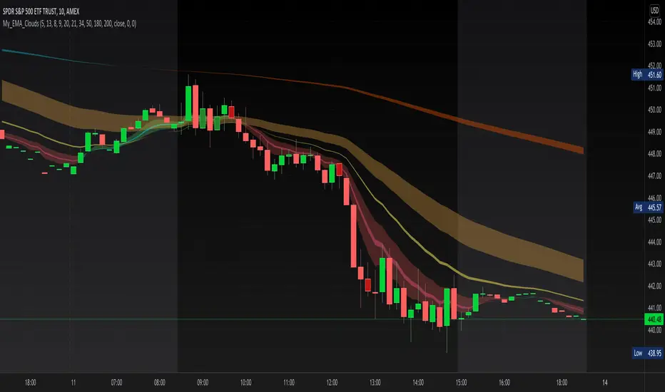 EMA Clouds are used for identifying trends. It helps to see moving averages as in a range especially when you look at them in Micro time frames like 1/5/10/15/30 mins. So these Clouds could be used for Intraday trading for identifying trends and pullbacks.