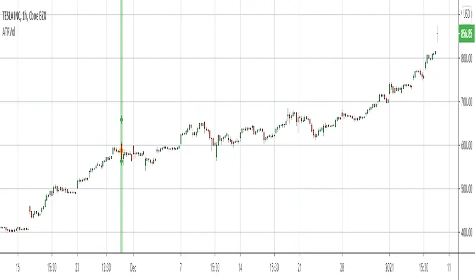 The script measures the unique size of each bar compared to the Average True Range (ATR) of the evaluation period. The evaluation period can be set in the inputs. The desired benchmark for what will be highlighted is also set in the inputs as a percentage. The default settings are to evaluate the last 26 bars for ATR and highlight bars that are 300% or larger than ATR.