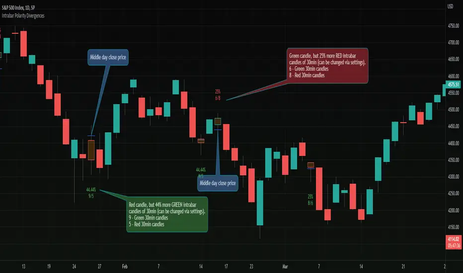 This indicator is based on Tradingview example but with enhanced capabilities to show the percentage of intrabars opposite bars with the ability to display the mid-day candle close price drawn by a blue line.