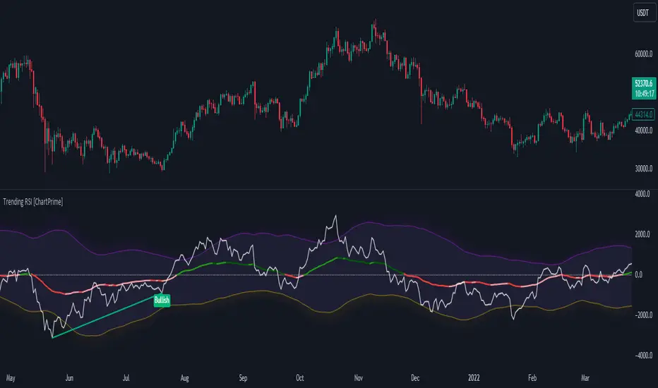 These types of movements are due to the market still trending and traditional RSI can not tell traders this. Trending RSI fixes this by introducing trend information back into the oscillator. By reverse engineering RSI we have been able to make a new indicator that is no longer bound between 0 and 100. Instead it provides the traditional 70 and 30 zones as bands, and 50 as a center line that still represent these zones perfectly. This transforms RSI into a centered oscillator instead of a normalized oscillator. When the market is trending our indicator represents this as the center line being below or above 0. Just like MACD the center line is colored to represent the market phases. This helps in identifying reversals more clearly by adding a layer of confluence to the already renowned RSI. We have also included a novel filtering technique that has a low lag to smoothing ratio. This is primarily used to smooth the bands by default but you can also utilize this on the RSI. Several alerts have been included to provide users with easy to configure signals.