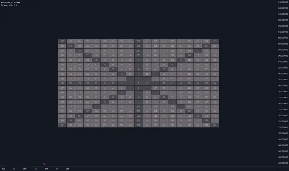 This script is made to make it easy for traders to visualize the movement of price along the square of nine table. This script Places the square of nine table right infront of you in the middle of the screen, which is why it's suggested that you would use it on the side of your main chart.