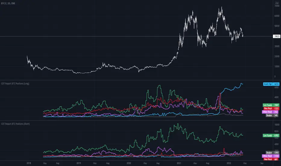 Showing the Commitments of Traders (COT) report(*) for BITCOIN Positions - CHICAGO MERCANTILE EXCHANGE (futures only) with COT charts on TradingView data.