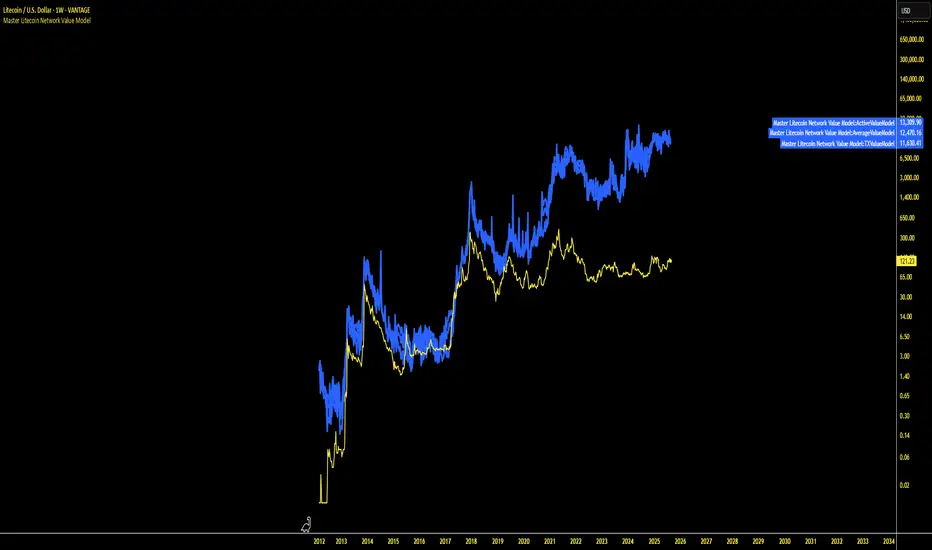 Master Litecoin Network Value Model DescriptionThe Master Litecoin Network Value Model is a powerful open-source TradingView script designed to provide insights into Litecoin's network fundamentals relative to Bitcoin. Developed by masterbtcltc, this model combines on-chain metrics and market data to assess Litecoin's intrinsic value in comparison to Bitcoin.