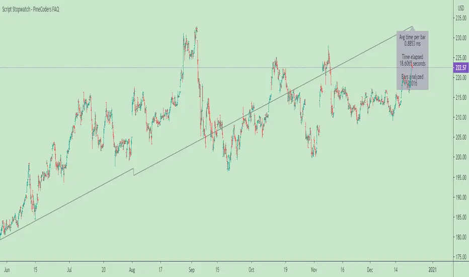 This script calculates the run time of a Pine script. While its numbers are not very precise and it doesn’t work on all scripts, it will help developers calculate run times more precisely than by hand, and so provides Pine coders with an additional profiling tool to help them optimize their code.