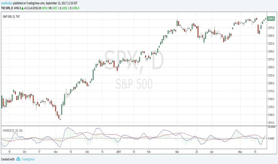 This is a modified version of the MACD (Moving Average Convergence/Divergence) oscillator. Instead of using exponential moving averages this modified version make use of simple moving averages. The default periods for this modified version of MACD is 3/10/16. This modified version of the MACD oscillator is described in detailed in Appendix B in the book The Art and Science of Technical Analysis: Market Structure, Price Action and Trading Strategies by Adam Grimes.