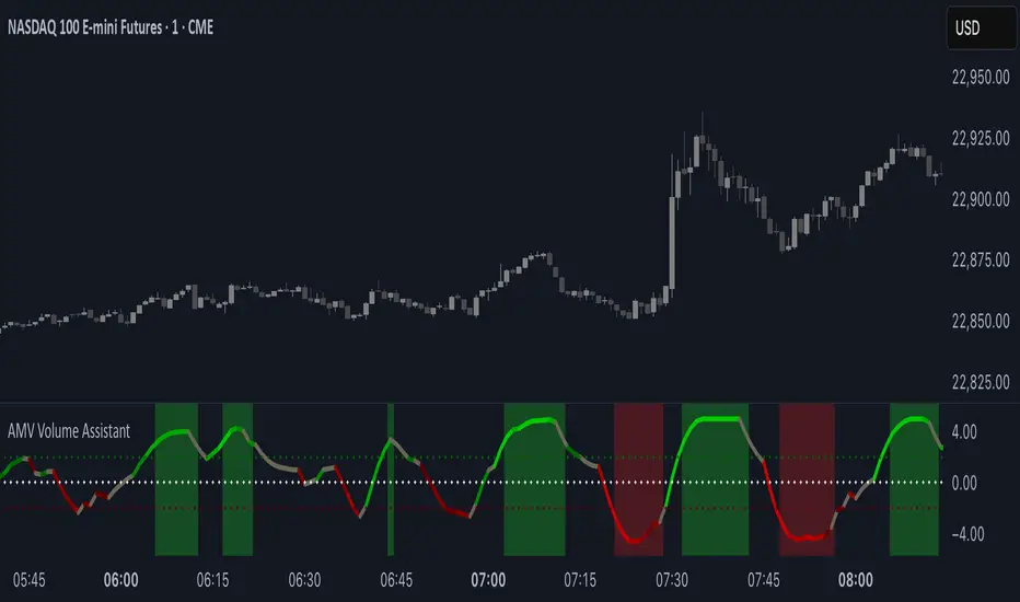 The AMV Volume Assistant is a custom tool that visualizes volume delta strength using percentile-based scoring. It helps identify potential overbought and oversold conditions by measuring how strong recent buying or selling pressure is compared to historical volume behavior.