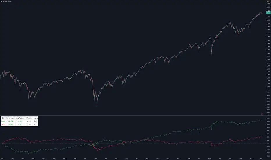 The Even vs Odd Days Performance indicator is designed to visualise and compare the performance of even-numbered days versus odd-numbered days. This indicator explores one of the many calendar based anomalies that exist in financial markets.