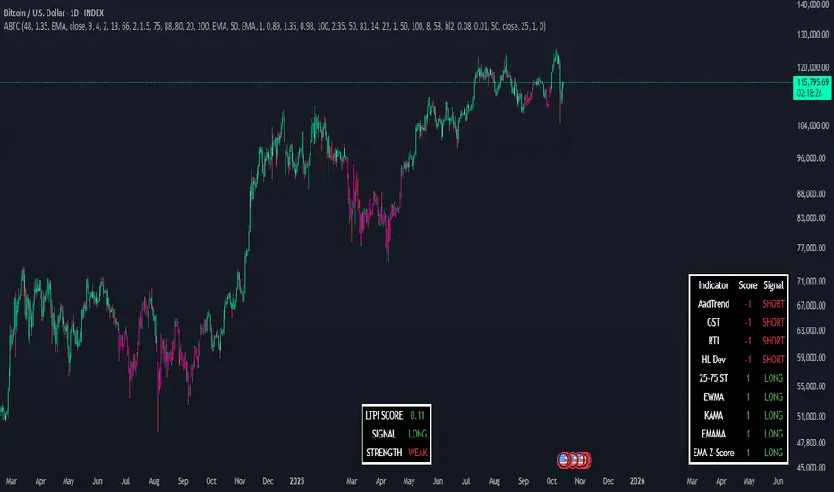 AlphaBTC is a consensus-based long-term trend probability indicator designed specifically for Bitcoin and cryptocurrency markets. It combines 9 independent trend detection methodologies into a single probabilistic score ranging from -1 (strong bearish) to +1 (strong bullish). Unlike single-indicator systems that can produce frequent false signals, AlphaBTC requires agreement across multiple analytical frameworks before generating directional signals.