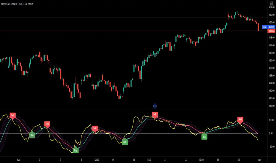 This indicator is the Mobo Bands (Momentum Breakout Bands). These bands are bollinger bands that have an adjusted standard deviation. There are Buy signals when it has momentum breakouts above the bands for moves to the upside and Sell signals when it has momentum breakouts below the bands for moves to the downside. The bands simply suggest that all markets have periods of chop which we all know to be true. While the price is inside the bands it is said to be trendless. Once the breakouts happen you can take trades in the breakout direction. I like to use these to swing trade options on the hourly timeframe but the bands should work on most instruments and timeframes. I like to use it to take swings on SPY on the 1 hour chart for entries and use the Daily chart for trend confirmation.