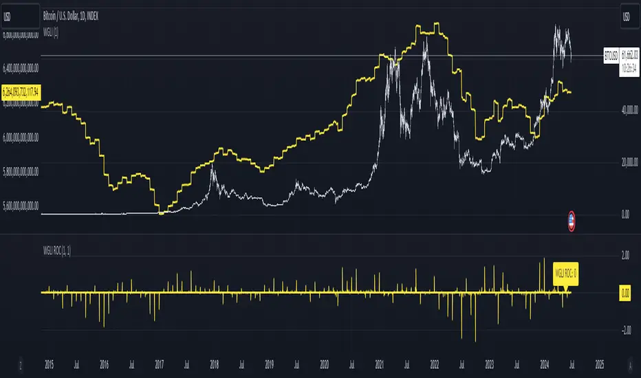 The Weighted Global Liquidity Index (WGLI) ROC indicator calculates the rate of change (ROC) of the WGLI, providing valuable insights into the dynamics of global liquidity. The WGLI consolidates major central bank balance sheets and key financial indicators, such as Foreign Exchange Reserves, Interbank Rates, and Interest Rates, converted to USD and expressed in trillions. Specific US accounts like the Treasury General Account (TGA) and Reverse Repurchase Agreements (RRP) are subtracted from the Federal Reserve's balance sheet for a more detailed view of US liquidity.