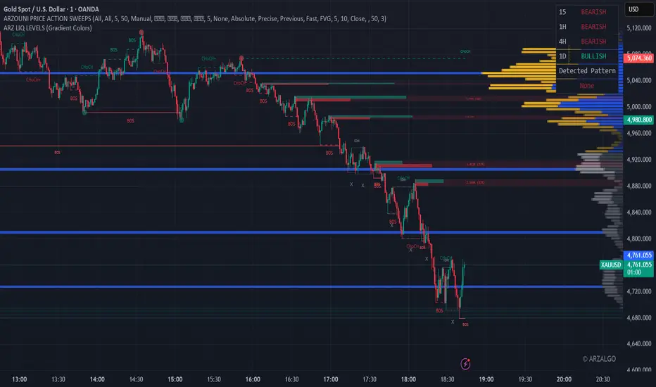 ARZ LIQ LEVELS is a liquidity-focused Volume Profile tool that maps where the market has traded the most (and the least) over a customizable lookback range. It highlights key high-volume nodes (HVN), low-volume nodes (LVN), and optional peak/trough clusters, while also plotting the main institutional reference levels: POC (Point of Control), VAH (Value Area High), and VAL (Value Area Low).