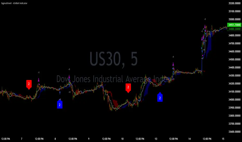 The IchiBot Indicator has been used to develop automated trading systems. It leverages the open-source Ichimoku framework provided by Trading View, to enable users to creatively generate over 1 trillion different combinations of trading conditions with the use of multiple timeframes to create unique “signal labels” that can be used to create custom strategies or provide in depth market analysis. At the end of this description, I have provided an example of input settings for a simple scalping strategy that I have back tested on US30 on the 5 minute timeframe.