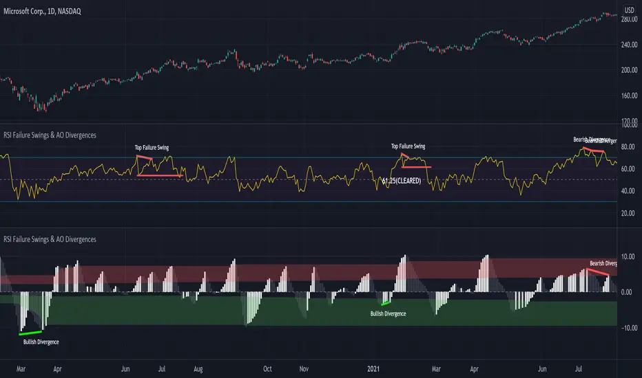 The script identifies RSI divergences, similar to other public scripts; however, RSI failure swings are also distinguished. When a failure swing is identified, the script calculates the highest RSI measurement (bottom failure swing) or the lowest RSI measurement (top failure swing) between the two RSI pivot points. A continually updating line is plotted at the "fail point" until it is penetrated for two sessions! In addition, the script displays the RSI fail point measurement. RSI bearish divergences are only distinguished when both RSI peaks form above 70. bullish divergences are only distinguished when both RSI troughs form below 30. Top failure swings require the initial RSI peak be above 70, the second RSI peak can form at any measurement. Bottom failure swings require the initial RSI trough be below 30, the second RSI trough can form at any measurement.