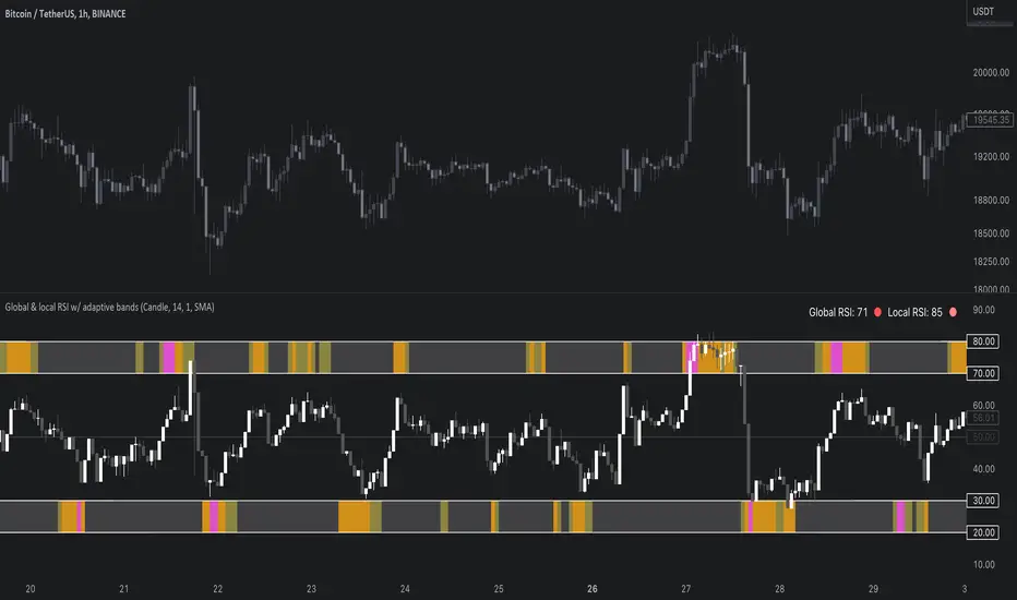 As the terms global and local imply, global RSI describes broad relative strength, whereas local RSI describes local relative strength within the broad moves. A macro and micro view of relative strength so to speak. Global and local RSI are simply regular RSI and stochastic RSI. Local RSI extremes ( stochastic RSI oversold/overbought) often mark a pivot in RSI which naturally reflects to price. Local RSI extremes are visualized inside the global RSI bands (upper band for overbought, lower band for oversold) in a "heat map" style.