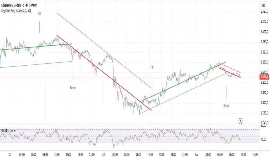 As an example of the descriptive power of Pine Script, this very short example traces a 'segment regression', a result not entirely obvious with so few lines of code, repositioning them when the previous inference moves away from the graph beyond the pre-set limit.