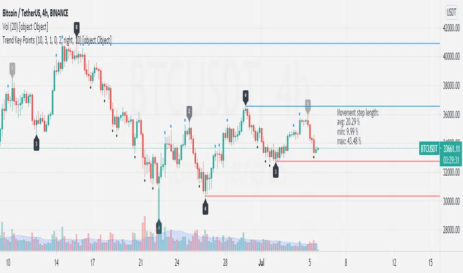 Each trend has its high and low key points that are important in the next prices. Sometimes it's hard to find out the keys with a naked eye, so I tried to code a simple indicator to marking these points also, as a bonus, to draw support and resistance lines from previous critical pivot points.