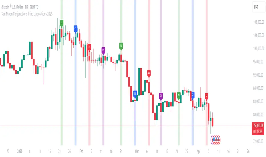 this script is an astrological tool designed to overlay significant Sun-Moon aspect events for 2025 on a Bitcoin chart. It highlights key lunar phases and aspects—Conjunctions (New Moon) in blue, Squares in red, Oppositions (Full Moon) in purple, and Trines in green—using background colors and labeled markers. Users can toggle visibility for each aspect type and adjust label sizes via customizable inputs. The script accurately marks events from January through December 2025, with labels appearing once per event, making it a valuable resource for exploring potential correlations between lunar cycles and Bitcoin price movements.