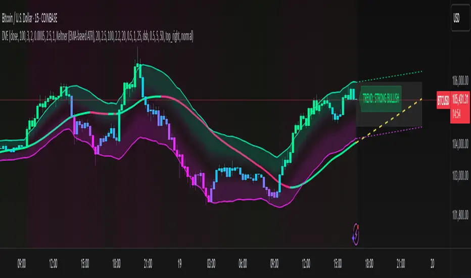 The Dynamic Volatility Envelope is an advanced, multi-faceted technical indicator designed to provide a comprehensive view of market trends, volatility, and potential future price movements. It centers around a customizable linear regression line, enveloped by dynamically adjusting volatility bands. The indicator offers rich visual feedback through gradient coloring, candle heatmaps, a background volatility pulse, and an on-chart trend strength meter.