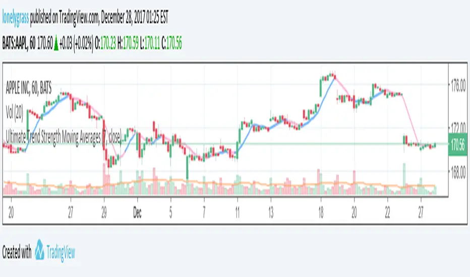 Users can select the sort of moving average they would like to use, such as SMA, EMA, WMA and VWMA, and just change the time span you want to look at! Blue color signalizes an uptrend while pink color signalizes a downtrend. Let's utilize it to its fullest.