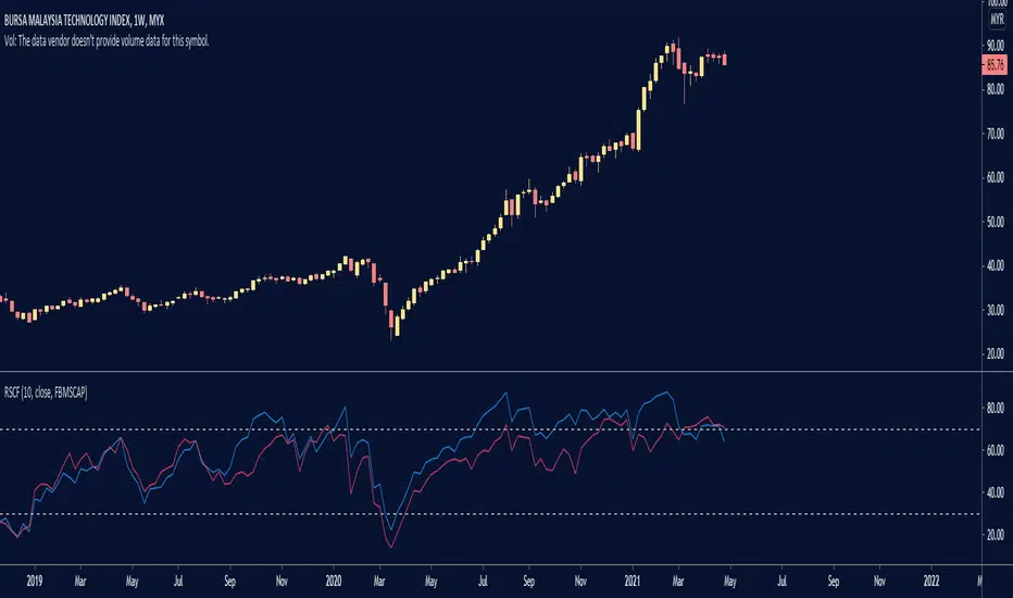 Shows the strength of current symbol relative to strength of another symbol, defaulted to Bursa Malaysia broad market index: FBMSCAP. Best viewed in weekly chart.