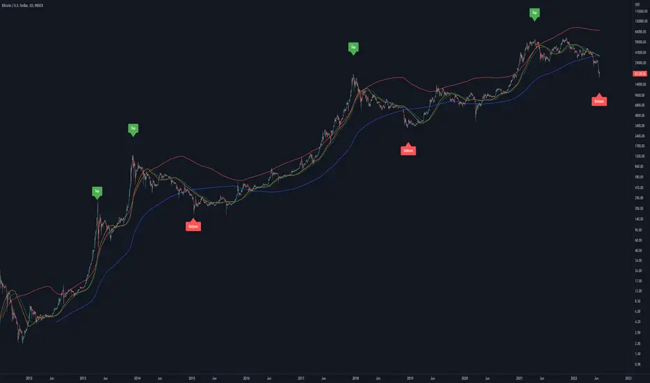 Tops are signaled by the fast top MA crossing above the slow top MA, and bottoms are signaled by the slow bottom MA crossing above the fast bottom MA. Alerts can be set on top and bottom prints. Does not repaint.