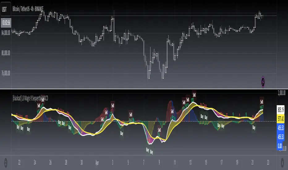 The [blackcat] L3 Magic-9 Sequential MACD indicator is an advanced tool designed to enhance the traditional Moving Average Convergence Divergence (MACD) by incorporating sequential patterns. This script calculates various MACD components and applies custom logic to identify potential buy and sell signals based on specific sequential conditions 📊💹.