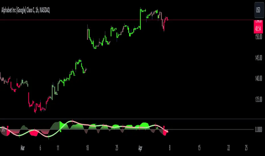 Finally, SRI smoothes shadow range and plots it as a histogram, and also smoothes and plots range as a signal line. Useful up and down triangles show trend changes, which optionally colour the chart bars.