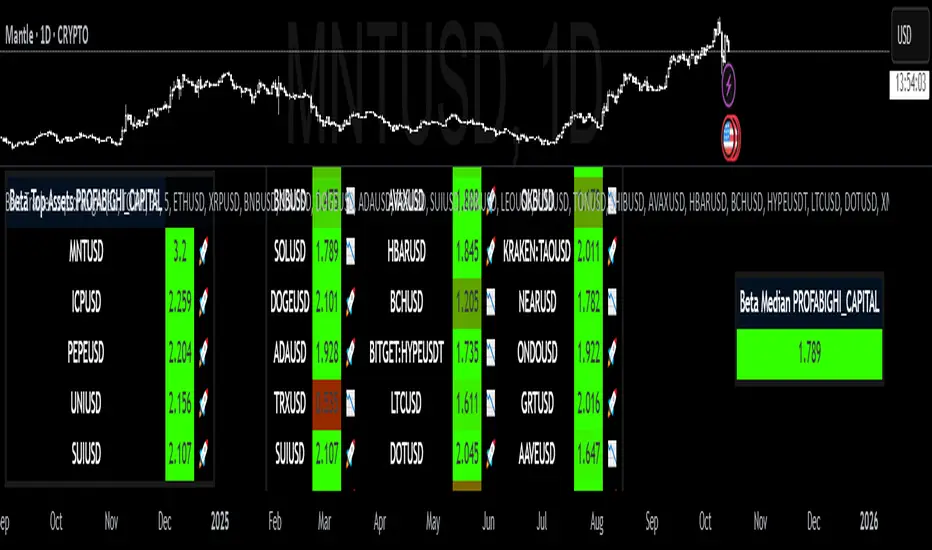 The Beta Tracker → PROFABIGHI_CAPITAL indicator quantifies market sensitivity by calculating the beta coefficient for up to 33 customizable altcoins relative to a selected benchmark over a user-defined lookback, revealing how assets amplify or dampen systemic movements. It dynamically renders color-gradient tables with individual betas, median values, and sorted top sensitivities alongside emoji indicators, enabling traders to assess volatility alignment and construct diversified portfolios based on risk exposure profiles.