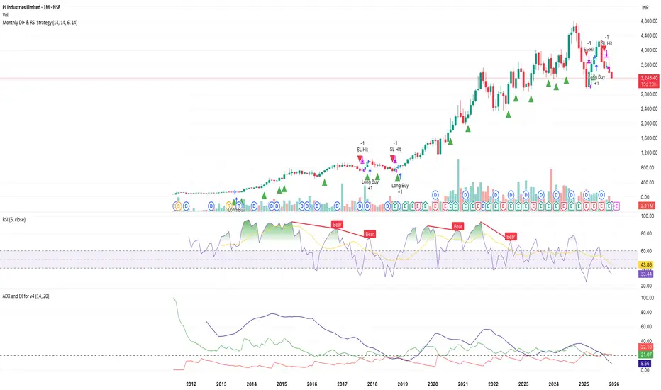 Overview This strategy is designed to capture significant trend reversals and continuations on the Monthly timeframe. It combines the trend-following capability of the Directional Movement Index (DMI) with the fast momentum detection of RSI (Period 6).
