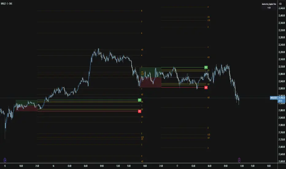 Fixed the bug in Range Presets (Previous 15m - Weekly) where lines would extend past where they should when using the historical sessions greater than 1. For a cleaner look make sure to turn off the range boxes in the settings so drawings don't overlap.開源腳本