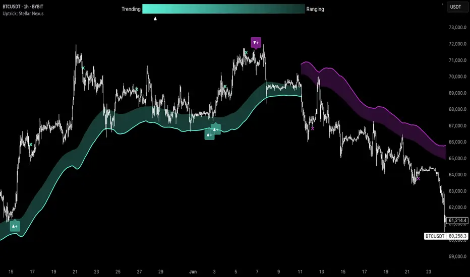 Uptrick: Stellar Nexus is a comprehensive, multi-layer script that merges aesthetic clarity with functional depth. It combines diverse overlays, signal engines, probability analyses, and a heads-up market meter into one cohesive tool. By handling trending vs. ranging states, evaluating asset predictability, and offering selective take-profit cues, it serves as a versatile companion for traders who want organized, visually intuitive guidance. Its originality is found not only in how it disguises internal computations, but in the ease with which users can cycle through different overlays and signals to suit changing market conditions. As always, personal due diligence, market awareness, and risk management remain essential. Stellar Nexus simply provides a refined canvas on which to read and interpret price action more confidently.