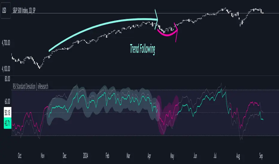 Trend Following: The standard deviation bands provide a clearer view of momentum shifts in the RSI, allowing traders to follow the trend more confidently.