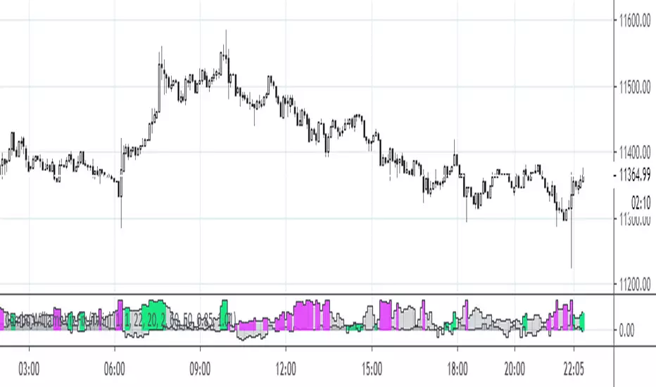 My implementation of this wonderful indicator features both up and down movements. Both up & down flavors have two versions (fields tp and tp2, each having two values). Color can be reversed as desired (rev). By default colors show continuation, reversed colors show reversion (as intended originally).