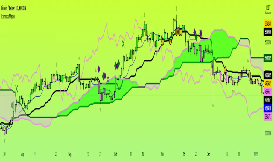 Ichimoku Cloud Master aims to provide the ichimoku trader with easy alert functionality to not miss out on valuable trade setups. The key purpose of this script is to better visualise crucial moments in Ichimoku trading. These alerts should not be used for botting in my opinion as they always need a human to confirm the ichimoku market structure. For example, is the Kijun-Sen flat and too far away from price? A good ichimoku trader will not enter at such a point in time.